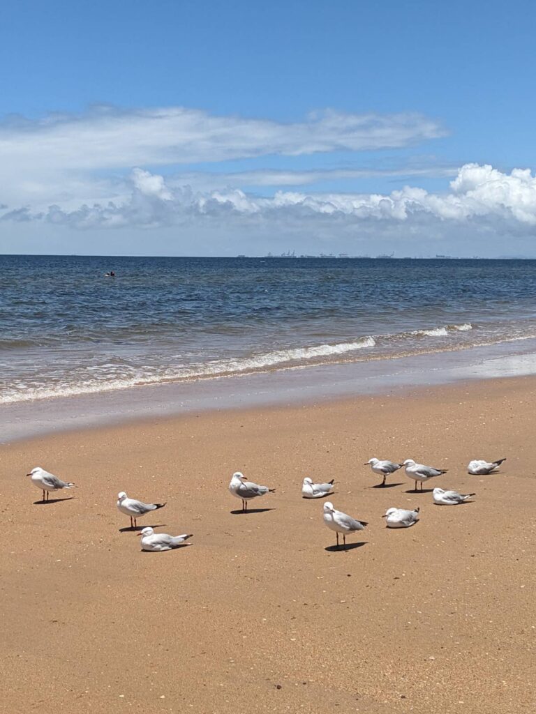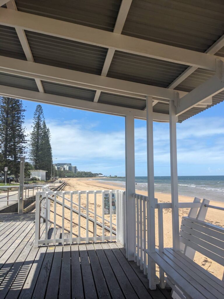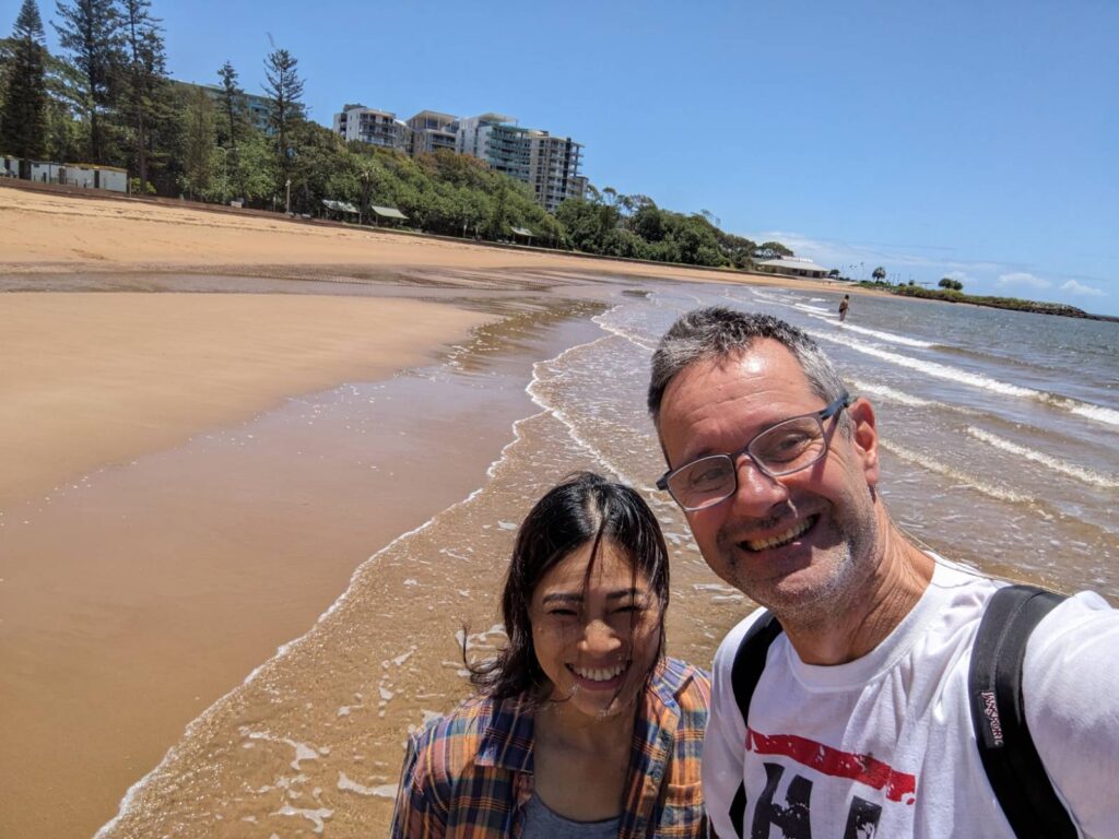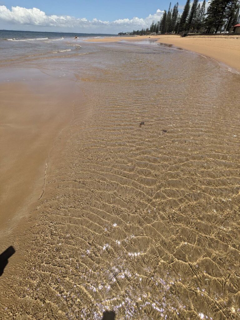 Auch hier haben wir uns wider eine Mobilitätskarte besorgt. Eine Fahrt kostet jeweils nur 50 AUD Cent, das sind 30 € Cent. Wir fuhren mit einem der Züge hinaus an eine Vorstadt am Meer: Redcliffe. Die Fahrt dauerte ca eine Stunde und kostete auch nur 50 ct. Hier gibt es unendlichen Sandstrand, supersauber, mit glasklarem Wasser, beinahe ohne Menschen!